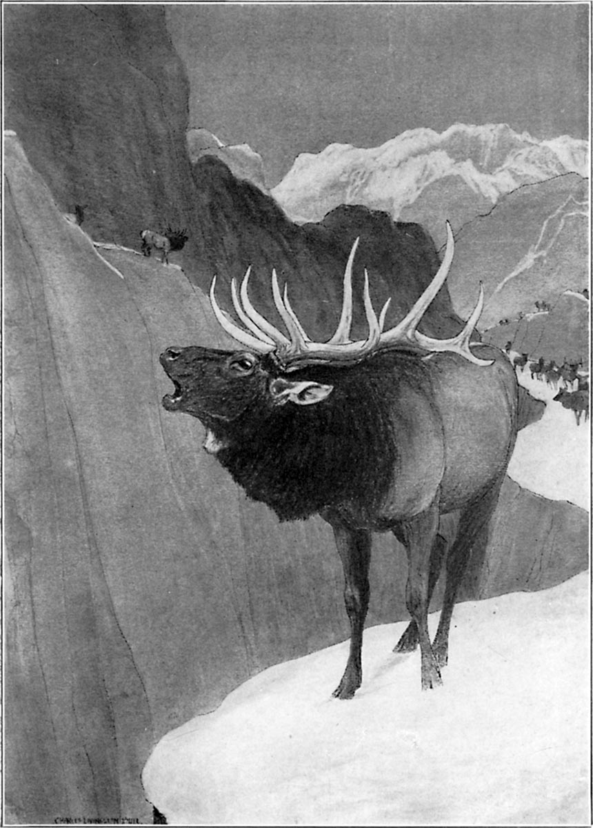 And the love-making time of the antlered tribes is ushered in with the season of short blue. As Breed moved north the whistling snorts of lovelorn bucks reached his ears day after day. The clarion bugles of challenging bulls was promise of meat in plenty. Bighorn rams squired their bands of ewes on the plateaus and pinnacles above timber line.