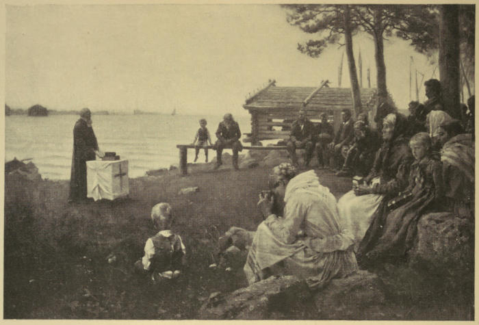 In Brittany it is the custom to bless houses, and this ceremony is not always accomplished without some bluster; above all, if the spirit of the dead should be attached to it. When a Breton suspects his house to be under ghostly domination, he sends for a powerful fellow in sacerdotal raiment to dislodge the devil. The priest comes, clad in surplice, and, holding his stole in hand, takes off his boots, so that he “shall be a priest to the very ground.” We are told that the staircase and the floors are inevitably covered with sand as evidence of the traces of the ill-intentioned dead. The priest must follow[20] those sandy traces as far as the chamber where they stop. There he shuts himself up, bursts into fervent prayer, and has a hand-to-hand fight with the evil spirit. His triumph is asserted as soon as he succeeds in casting his stole over the neck of the dead, who has taken the shape of an animal, usually a black dog. The beadle and the sacristan are told off to carry away the possessed animal. They lead it to a sterile marsh, or a forsaken quarry, or a meadow hollow, and the priest cries, “Here shalt thou henceforth dwell,” and lets the evil spirit go free; saying this, he makes a wide circle, and departs.[2]