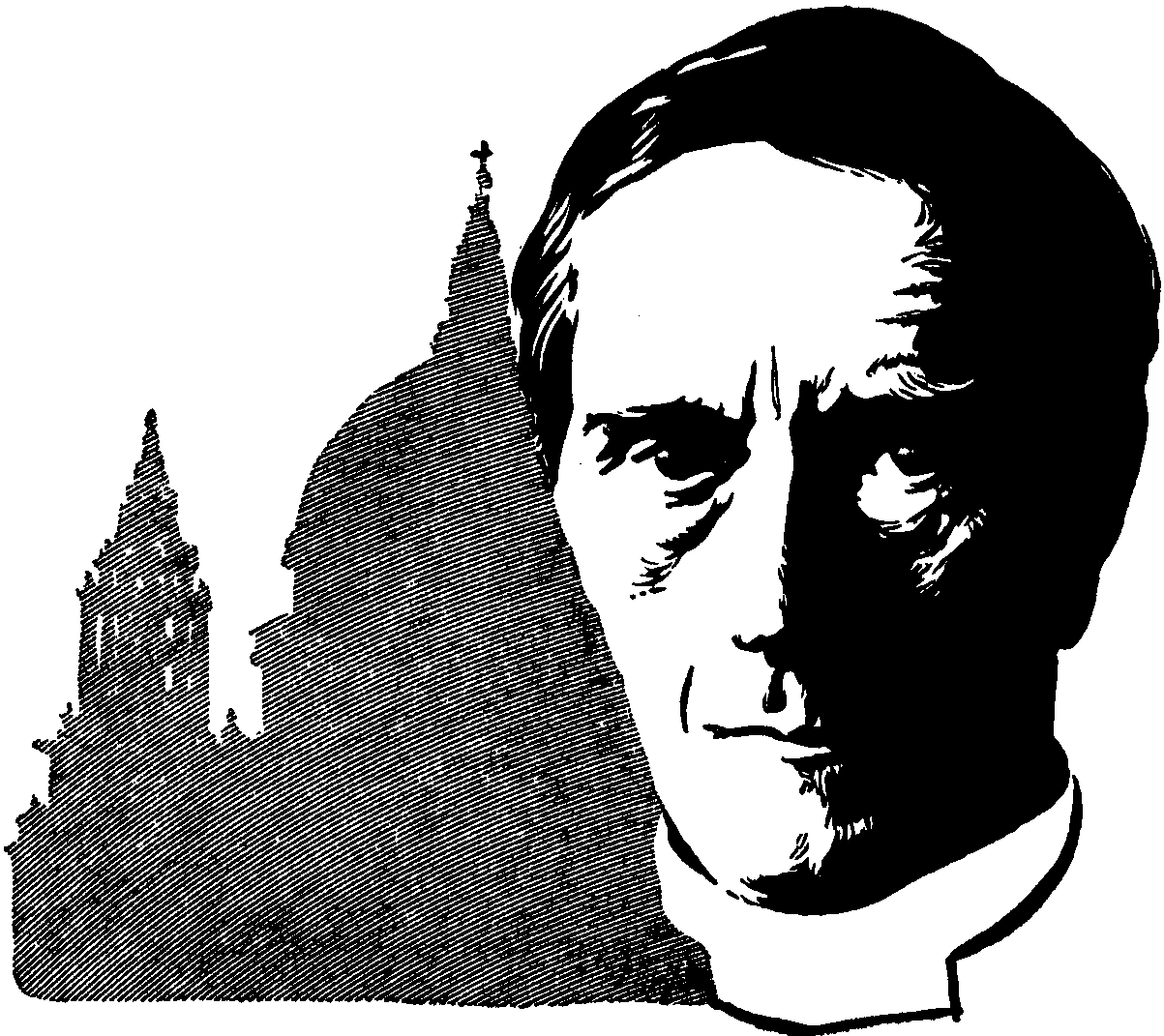 One cannot look at that tall lean figure in its purple cassock, with the stooping head, the somewhat choleric face, the low forehead deeply scored with anxiety, the prominent light-coloured and glassy eyes staring with perplexity under bushy brows, which are as carefully combed as the hair of his head, the large obstinate nose with its challenging tilt and wide war-breathing nostrils, the broad white moustache and sudden pointed beard sloping inward; nor can one listen to the deep, tired, and ghostly voice slowly uttering the laborious ideas of his troubled mind with the somewhat painful pronunciation of the elocutionist (he makes chapell of Chapel); nor mark his languorous movements and the slow swaying action of the attenuated body; one cannot notice all this without feeling that in spite of his great courage and his iron tenacity of purpose, he is a little weary of the battle, and sometimes even perhaps conscious of a check for the cause which is far dearer to him than his own life.