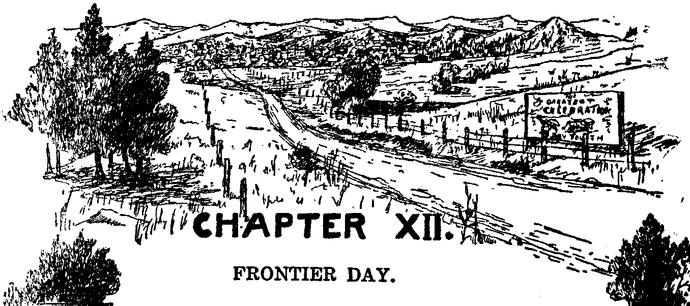 Behind him the little city—so picturesque in its mountain basin, with the wild, unfenced land coming down to its very dooryards—was slowly awakening after the last mad night of its celebration. The tents of the tawdry shows that had tempted the crowds with vulgar indecencies, and the booths that had sheltered the petty games of chance where loud-voiced criers had persuaded the multitude with the hope of winning a worthless bauble or a tinsel toy, were being cleared away from the borders of the plaza, the beauty of which their presence had marred. In the plaza itself—which is the heart of the town, and is usually kept with much pride and care—the bronze statue of the vigorous Rough Rider Bucky O'Neil and his spirited charger seemed pathetically out of place among the litter of colored confetti and exploded fireworks, and the refuse from various "treats" and lunches left by the celebrating citizens and their guests. The flags and bunting that from window and roof and pole and doorway had given the day its gay note of color hung faded and listless, as though, spent with their gaiety, and mutely conscious that the spirit and purpose of their gladness was past, they waited the hand that would remove them to the ash barrel and the rubbish heap.