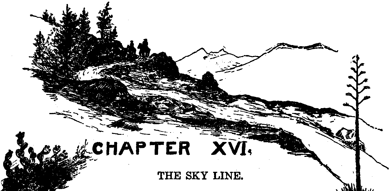 So she watched him go. Sitting there at home, she watched him ride up the winding road. Now he was in full view on some rocky shoulder of the mountain—now some turn carried him behind a rocky point—again she glimpsed him through the trees—again he was lost to her in the shadows. At last, for a moment, he stood out boldly against the wide-arched sky—and then he had passed from sight—over the sky line, as he had said.