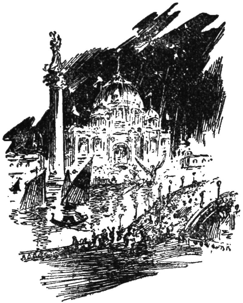 It is hardly possible, in mere words, to convey an idea of what the fair will be like, but from previous chapters the reader will have formed his own opinion and his imagination must supply the rest. To say that it will be the most wonderful exhibition in all history is to employ very mild language indeed. The grounds will present a sight that will never be forgotten. At night, when all the buildings are glittering with their myriads of electric lights and great showers of fireworks soaring heavenward; when the great lake itself fairly blazes under the glare of illuminated craft and the stupendous carnival is at its height, the visitor may be pardoned, if, in the excitement of the moment, he fancies that he has fallen off the earth and stepped into another world, peopled by fairies and decked with palaces reared by the magicians’ wand.