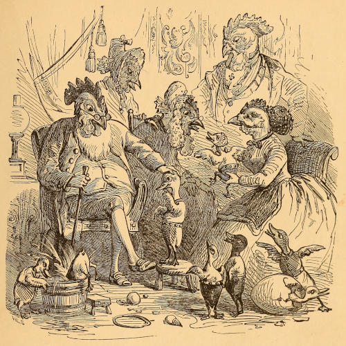“Well, but bless me, what’s the matter with their bills?” said Dame Scratchard. “Why, my dear, these chicks are deformed! I’m sorry for you, my dear, but it’s all the result of your inexperience; you ought to have eaten pebble-stones with your meal when you were setting. Don’t you see, Dame Kertarkut, what bills they have? That’ll increase, and they’ll be frightful!”