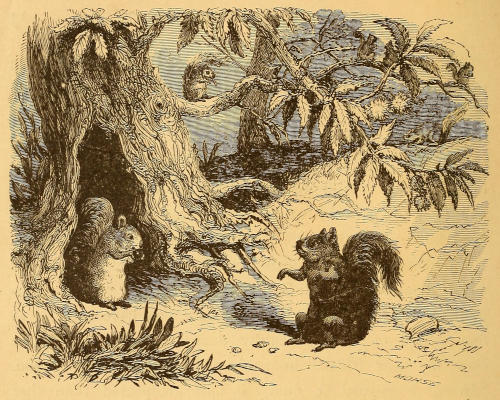 Now nobody could tell why or wherefore Master Featherhead looked upon himself as injured and aggrieved, since he was living in a good hole, with plenty to eat, and without the least care or labor of his own; but he seemed rather to value himself upon being gloomy and dissatisfied. While his parents and brothers and sisters were cheerfully racing up and down the branches, busy in their domestic toils, and laying up stores for the winter, Featherhead sat gloomily apart, declaring himself weary of existence,[17] and feeling himself at liberty to quarrel with everybody and everything about him. Nobody understood him, he said;—he was a squirrel of a peculiar nature, and needed peculiar treatment, and nobody treated him in a way that did not grate on the finer nerves of his feelings. He had higher notions of existence than could be bounded by that old rotten hole in a hollow tree; he had thoughts that soared far above the miserable, petty details of everyday life, and he could not and would not bring down these soaring aspirations to the contemptible toil of laying up a few chestnuts or hickory-nuts for winter.
