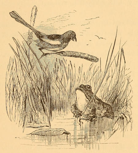 Sometimes, strolling down to the river, we have seen his solemn green spectacles emerging from the tall water-grasses, as he sat complacently looking about him. Near by him, spread out on the sunny bottom of the pool, was a large flat-headed water-snake, with a dull yellow-brown back and such a swelled stomach that it was quite evident he had been making his breakfast that morning by swallowing some unfortunate neighbor like poor little Cri-cri. This trick of swallowing one’s lesser neighbors seems to prevail greatly among the people who live in our river. Mr. Water-snake makes his meal on little Mr. Frog, and Mr. Bullfrog follows the same example. It seems a sad state of things; but then I suppose all animals have to die in some way or other, and perhaps, if they are in the habit of seeing it done, it may appear no more to a frog to expect to be swallowed some day, than it may to some of us to die of a fever, or be shot in battle, as many a brave fellow has been of late.