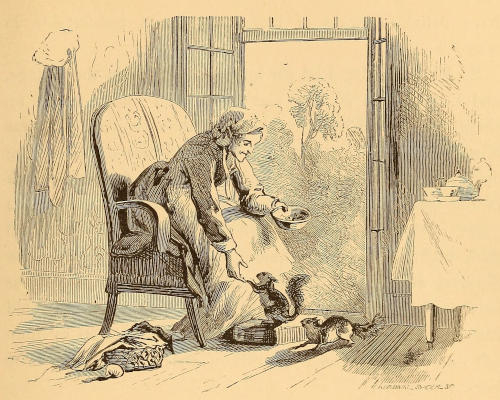 By constant watching, she discovered that he had a small hole of his own in the grass-plot a few paces from her back door. So she used to fill her pockets with hazelnuts, and go out and sit in the back porch, and make a little noise, such as squirrels make to each other, to attract his attention.
