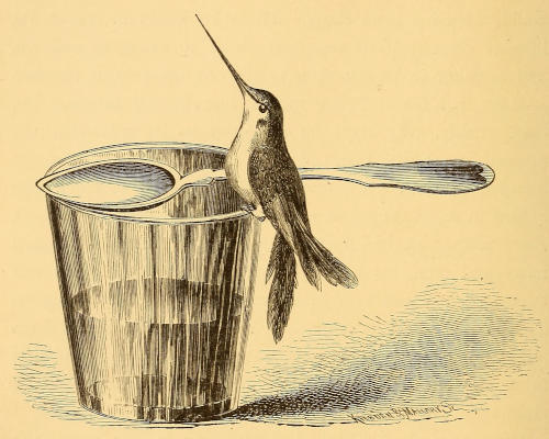 These little incidents show that it would not ever be a difficult matter to tame humming-birds,—only they cannot be kept in cages; a sunny room with windows defended[184] by mosquito-netting would be the only proper cage. The humming-bird, as we are told by naturalists, though very fond of the honey of flowers, does not live on it entirely, or even principally. It is in fact a little fly-catcher, and lives on small insects; and a humming-bird never can be kept healthy for any length of time in a room that does not admit insects enough to furnish him a living. So you see it is not merely toads, and water-snakes, and such homely creatures, that live by eating other living beings,—but even the fairy-like and brilliant humming-bird.