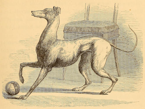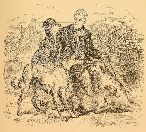In the morning, when they started for a ramble, the[169] dogs would all be on the alert to join them. There was first a tall old staghound named Maida, that considered himself the confidential friend of his master, walked by his side, and looked into his eyes as if asserting a partnership in his thoughts. Then there was a black greyhound named Hamlet, a more frisky and thoughtless youth, that gambolled and pranced and barked and cut capers with the wildest glee; and there was a beautiful setter[170] named Finette, with large mild eyes, soft silken hair, and long curly ears,—the favorite of the parlor; and then a venerable old greyhound, wagging his tail, came out to join the party as he saw them going by his quarters, and was cheered by Scott with a hearty, kind word as an old friend and comrade.