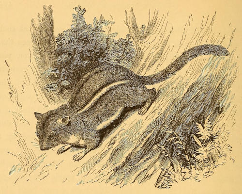In a minute or two up would pop the little head with the bright eyes, in the grass-plot, and Master Whiskey would sit on his haunches and listen, with one small ear cocked towards her. Then she would throw him a hazelnut, and he would slip instantly down into his hole again. In a minute or two,[188] however, his curiosity would get the better of his prudence; and she, sitting quiet, would see the little brown-striped head slowly, slowly coming up again, over the tiny green spikes of the grass-plot. Quick as a flash he would dart at the nut, whisk it into a little bag on one side of his jaws, which Madame Nature has furnished him with for his provision-pouch, and down into his hole again! An ungrateful, suspicious little brute he was too; for though in this way he bagged and carried off nut after nut, until the patient little woman had used up a pound of hazelnuts, still he seemed to have the same wild fright at sight of her, and would whisk off and hide himself in his hole the moment she appeared. In vain she called, “Whiskey, Whiskey, Whiskey,” in the most flattering tones; in vain she coaxed and cajoled. No, no; he was not to be caught napping. He had no objection to accepting her nuts, as many as she chose to throw to him; but as to her taking any personal liberty with him, you see, it was not to be thought of!