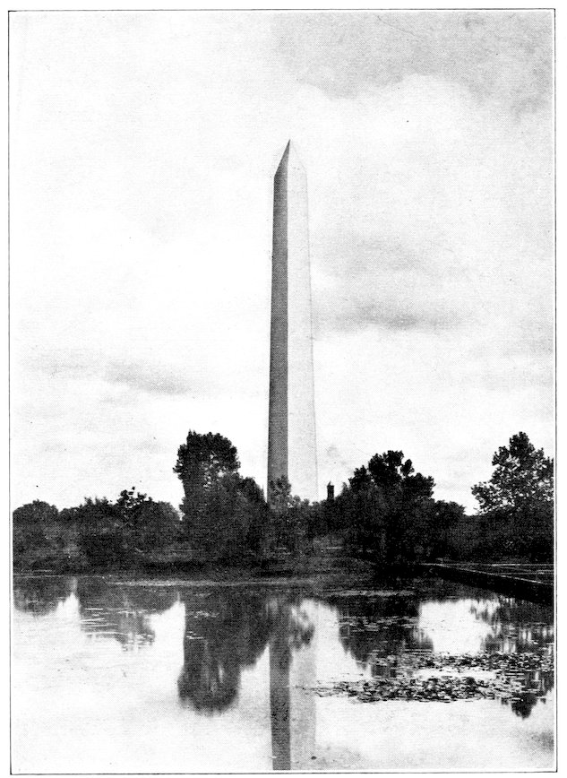 182The Washington monument, nearly six hundred feet high, is said to be the highest monument in the world. It was erected in memory of George Washington. This grand structure is of pure white marble. From the top there is a magnificent view of the surrounding country. The monument, however, has suffered from the disintegrating effects of the weather, and from the ruthless hands of the relic-hunters. The majestic appearance of the monument grows upon the beholder, and its pearly whiteness reminds him of the character of Washington, which grows fairer in the mellowing light of history.