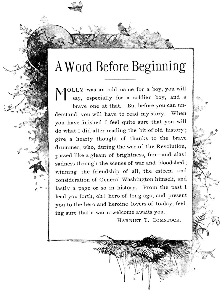 Molly was an odd name for a boy, you will say, especially for a soldier boy, and a brave one at that. But before you can understand, you will have to read my story. When you have finished I feel quite sure that you will do what I did after reading the bit of old history; give a hearty thought of thanks to the brave drummer, who, during the war of the Revolution, passed like a gleam of brightness, fun—and alas! sadness through the scenes of war and bloodshed; winning the friendship of all, the esteem and consideration of General Washington himself, and lastly a page or so in history. From the past I lead you forth, oh! hero of long ago, and present you to the hero and heroine lovers of to-day, feeling sure that a warm welcome awaits you.
