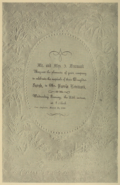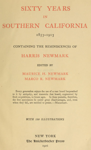 I have read no other such book with so unflagging interest and content as these memoirs of Harris Newmark. My personal acquaintance with Southern California for more than thirty years may color my interest in names and incidents; but I am appraising this book (whose proofs I have been permitted to read thoroughly) from the standpoint of the student of history anywhere. Parkman and Fiske and Coues and Hodge and Thwaites would join me in the wish that every American community might have so competent a memorandum of its life and customs and growth, for its most formative half-century.