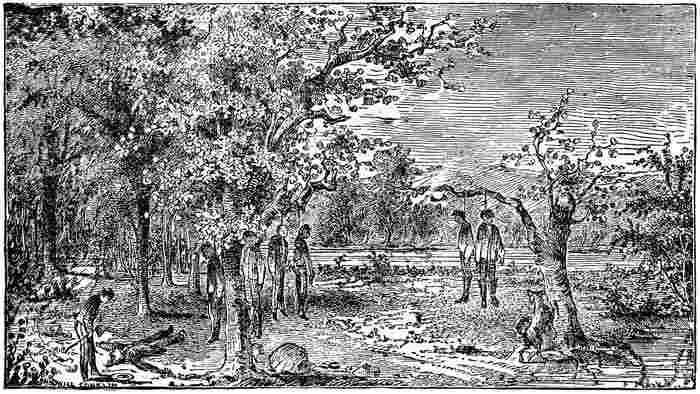 The bloodhounds were on his track, however, and swore either to kill him or drive him from the country. A vigilance committee composed of skulking murderers and red-handed robbers went one night to surprise the two brothers and end the hunt with a massacre. Forewarned, James and Coleman fled. The family were wantonly insulted, and a younger brother, John, a mere boy, was brutally beaten and then hung until life was almost extinct. This was done to force him to tell the whereabouts of James and Coleman.