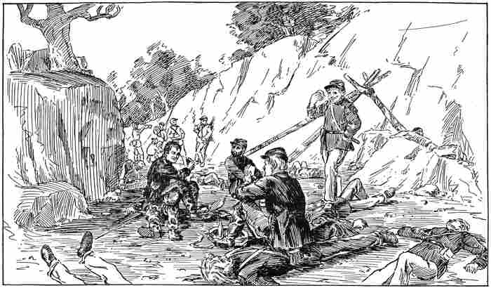 While the horses were eating the Guerrillas amused themselves with a sham battle, choosing sides and using corncobs for ammunition. In the midst of much240 hilarity and boisterousness, Glasscock’s keen eye saw through the blinding rain a column of cavalry, one hundred and twenty strong, approaching the barn at a trot.