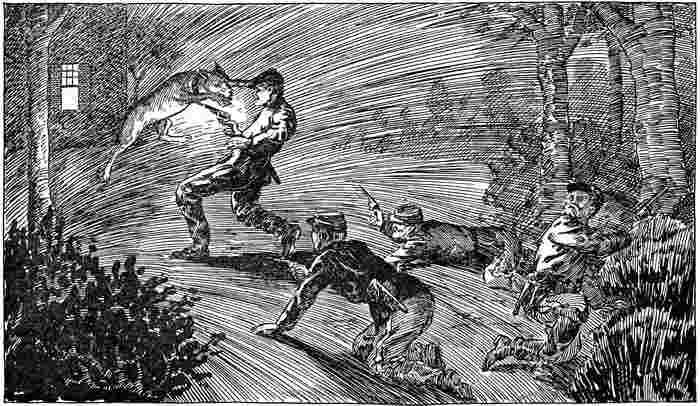 There was snow on the ground and the moon was shining. He saw that all the horses hitched to the256 fence had on cavalry saddles, and then he knew that the men were soldiers. He had but one of two things to do—drive them away or die.