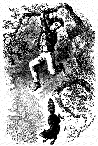 But the young naturalist was not one to hesitate long because there was difficulty or danger before him. He had made up his mind from the first to capture that wild-cat if possible, and now the opportunity was fairly before him. His hand was none of the steadiest as he drew off his glove and placed his fingers to his lips; and the whistle that followed was low and tremulous, very much unlike the loud, clear call with which he was accustomed to let Brave know that he was wanted and he hardly expected that the dog would hear it. A faint, distant bark, however, announced that the call had been heard, and in a few moments Frank heard Brave's long-measured bounds as he dashed through the bushes; and when the faithful animal came in sight, he felt that he had a friend that would stand by him to the last extremity. At this juncture Frank was startled by a loud rattling in the bushes, and the next moment the wild-cat sprang upon a fallen log, not half a dozen rods from the place where he was standing, and, growling fiercely, crouched and lashed his sides with his tail as if about to spring toward him. The trap hung from one of his hind-legs, but by some means he had relieved himself of the clog and chain, and he moved as if the weight of the trap were no inconvenience whatever. The young naturalist was frightened indeed, but bravely stood his ground, and clutched his ax desperately. What would he not have given to have had his trusty double-barrel in his hands! But he was not allowed much time for reflection. Brave instantly discovered the wild-cat, and sprang toward him, uttering an angry growl. Frank raised his ax and rushed forward to his assistance, and cheered on the dog with a voice which, to save his life, he could not raise above a whisper. The wild-cat crouched lower along the log, and his actions seemed to indicate that he intended to show fight. Brave's long, eager bounds brought him nearer and nearer to his enemy. A moment more and he could have seized him; but the wild-cat suddenly turned and sprang lightly into the air, and, catching his claws into a tree that stood full twenty feet distant, ascended it like a streak of light; and, after settling himself between two large limbs, glared down upon his foes as if he were already ashamed of having made a retreat, and had half a mind to return and give them battle. Brave reached the log just a moment too late, and finding his enemy fairly out of his reach, he quietly seated himself at the foot of the tree and waited for Frank to come up.