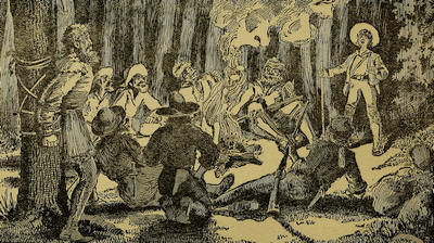 The boy’s dress was an odd mixture of the simple style of the prairies and the newest and most elaborate fashions of the Mexicans. He wore a sombrero, a jacket of dark-blue cloth, profusely ornamented with gold lace, buckskin trowsers, brown cloth leggings with green fringe, and light shoes, the heels of which were armed with huge Mexican spurs. His weapons consisted of a rifle, slung over his shoulder by a broad strap, a hunting knife and a brace of revolvers, which he carried in his belt, and a lasso, which was coiled upon the horn of his saddle. From his left shoulder hung a small deerskin haversack, to which was attached an ornamented powder-horn. The haversack contained bullets for his rifle, cartridges for his revolvers, and flint, steel and tinder for lighting a fire. Behind his saddle, neatly rolled up and held in its place by two straps, was a poncho which did duty both as overcoat and bed. He was mounted on a coal-black horse, which was very fleet, and so ill-tempered that no one besides his master cared to approach him.