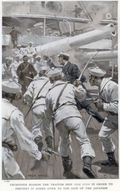 The remnant of her fleet, under Admiral Ting, had fought another bravely-contested naval action, and had been destroyed, with the exception of one ship, the Chen Yuen, which had been captured. Her southern fleet had been bottled up by another Japanese squadron, and Admiral Wong-lih had gone to Tien-tsin to see whether he could be of use there. The army in Korea had been crushed by an enemy superior in numbers and in everything else but bravery; and at the moment of Frobisher’s return the peace envoys were in the act of concluding the treaty of Shimonoseki.