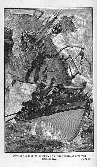 As I spoke I saw that San Domingo was laying in from the jib-boom end, he having, like myself, seen that we had got hold of the men; and presently he ranged up alongside me and, following my example, industriously set to work to throw the coils of braces, halliards, clewlines, and so on off the pins, and bend the ends of them into bowlines in readiness for hauling the rescued men up the side.