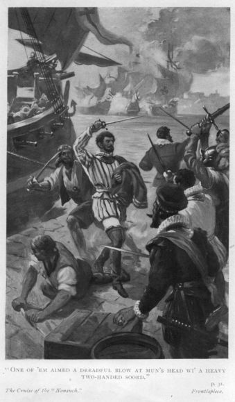 On the after deck but one solitary officer, clad in a complete suit of splendid armour, and with the hilt of his broken sword in his hand, stood among a heap of slain, and, seeing him, George sprang up on the rail of the galleon and hailed him: