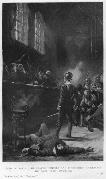 Twenty minutes later she ranged up alongside, and a party of ten Spaniards, dressed most extravagantly in the height of the prevailing mode, proceeded to climb with more or less difficulty the lofty side of the galleon, where, as they passed in through the entry port, they were received by George at the head of his officers. The contrast in appearance between these popinjays, arrayed in silks and satins of the most costly description, with splendid jewels round their necks, on their fingers, and in their ears, their oiled, curled, and perfumed locks surmounted by jaunty little caps of silk or velvet decorated with beautiful feathers secured in place by gem-set brooches, and the sturdy Devon lads, attired mostly in perfectly plain armour not altogether guiltless of rust, beneath which showed their well-worn clothing, was a striking one indeed, but there was a stern, business-like look on the faces of the Englishmen that promptly checked any disposition to sneer on the part of the Spaniards.