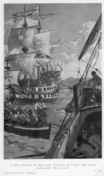 “So be it,” he said. Then, turning to one of the men who was with him, he directed him to release the Spaniard on the bench, and, having done that, to hand him the keys that he might release his comrades; after which he ordered the prisoners, wounded and unwounded, to be passed down into the boats, which done, the victors pulled away for the galleon. But they were scarcely alongside when the galley’s sweeps were thrust outboard and the craft was under way again, heading south, with one of the slaves proudly standing at the tiller and leading an enthusiastic cheer as the galley swept at speed close under the towering stern of the galleon.