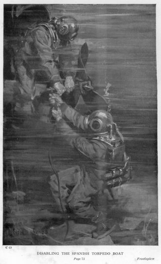 “Through American intervention—to put the whole thing in a nutshell,” answered Milsom. “Of course it is altogether too early yet to express an opinion in public upon the occurrence; but, strictly between ourselves, and in the privacy of this saloon, I don’t mind saying that I believe the Maine was deliberately destroyed, and that the submarine which was stolen from this ship was the instrument by which that was done!”