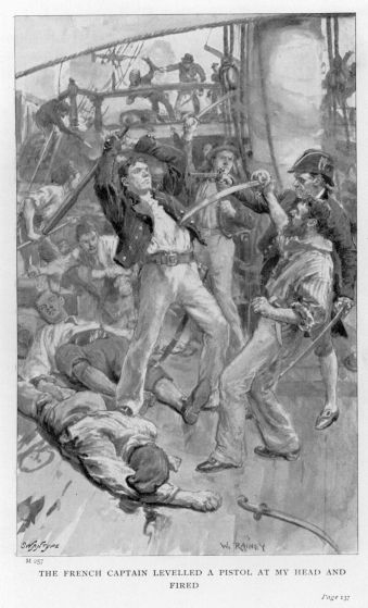 It took us less than ten minutes to close with the Indiaman; and as we ranged up on her lee quarter and swept alongside a party of some ten or a dozen jabbering and gesticulating Frenchmen jumped up on her poop and saluted us with an irregular fire of musketry, which, however, did no harm; and upon our people returning the fire three of the Frenchmen fell, while the rest tumbled off the poop in such a desperate hurry that our fellows were fairly convulsed with laughter. The skipper conned us alongside in such a masterly style that I do not believe the hulls of the two vessels actually touched at all—at least, I was unconscious of any shock—yet we were close enough for the two boarding-parties to spring with ease and certainty from our rigging into the Indiaman’s channels; and the next moment, as they tumbled in over the ship’s rail, our helm was eased up, and the vessels sheered apart, without having carried away so much as a rope-yarn. There was a tremendous scuffle on the Indiaman’s deck for perhaps half a minute, with a great popping of pistols, the sound of heavy blows, cheers from our lads, loud execrations on the part of the Frenchmen, a shriek or two of pain at some well-directed cut or thrust, then a rush forward, during which we remained some twenty fathoms to leeward of the Indiaman, ready to sheer alongside again and render assistance if necessary; and then Lovell sprang up on the poop and hailed that he had secured possession of the ship, and would haul his wind as soon as he could get in the studding-sails. Thereupon our helm was put hard up, and we wore short round, bracing sharp up on the starboard tack to intercept the lugger, which craft was now foaming along under all the canvas that she could spread.