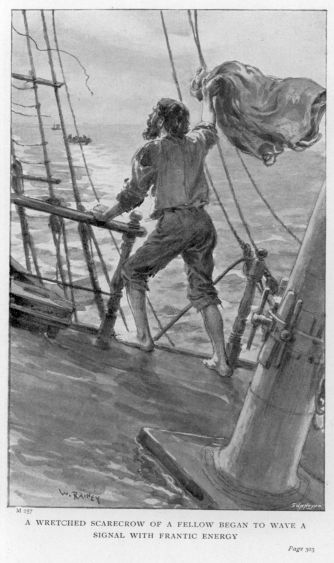 All these precautions, it must be understood, were adopted not so much from any apprehension of ultimate failure, for I had determined to have the galleon, but because I wanted to save my men. I now summoned Saunders down into the cabin, and read over to him the instructions that I had carefully prepared for his guidance during the earlier part of the day, explained them to him fully, and then handed him the paper. The men who were to accompany me on the expedition were next mustered in the ’tween-decks and sent to supper, after which their weapons were carefully inspected, and a liberal quantity of ammunition served out to them; and then, when I had satisfied myself that all was right, I made them a little speech, explaining what I purposed doing, and how I wanted it done; when, having enjoined them to observe the most absolute silence, the light was extinguished, all hands groped their way on deck, the boats were lowered and manned, and we shoved off, each boat attached by her painter to the one ahead, so that we might not part company in the profound darkness. It was presently found, however, that this precaution was unnecessary, the water being so brilliantly phosphorescent as to afford all the guidance that was needed; indeed, there was altogether too much luminosity to please me. We were even closer to the shore than I had imagined, for we had not been under way five minutes, when the gig, in which I led the way, grounded upon the sand. And as she did so, I became aware of a weird, gaunt-looking figure, clad in rags, standing at the water’s edge, close to the boat’s stem.