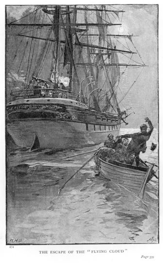 Gaily the good ship stemmed the tide as she ploughed her stately way up the river in the wake of the grimy little tug; and a right noble and beautiful sight did she present, in all the glory of fresh paint and newly-blacked rigging—laid on during a spell of fine weather experienced just before entering the channel—with her white canvas snugly stowed, yards laid accurately square, running-rigging hauled taut and neatly coiled down, with the house-flag floating at the main-royal-mast-head, the burgee at the mizen, and the red ensign at the gaff-end. Many were the admiring glances bestowed upon her from the craft which were passed either going up or down the river—for, being only in deep ballast trim, she towed light, and passed ahead of nearly all the inward-bound craft—and at length a great bluff-bowed, deeply-laden barque was overtaken, the quarter-deck occupants of which appeared to manifest not only admiration but quite a surprising amount of curiosity as the two vessels closed. For a little group of men and women had gathered aft on board this barque for the evidently express purpose of getting the longest and best possible view of the Flying Cloud, many of them being provided with opera-glasses, which seemed glued to their eyes, albeit it was evident from their occasional gestures that they were listening intently to the eager and excited utterances of one of their number, a shortish, thick-set, grey-haired man clad in blue serge garnished with gilt buttons, whom our friends naturally supposed to be the skipper of the craft. At length, as the Flying Cloud ranged up on the larboard quarter of the barque, the excited blue-clad figure appeared to suddenly go demented altogether, for, rushing to the barque’s gangway, he threw himself over rather than descended the vessel’s side into a boat which was towing alongside, and with imperious gestures seemed to command the boatmen to convey him to the approaching ship. They obeyed, and the distance of the two vessels being but short, in less than a minute a voice—well known, notwithstanding its excited, exultant ring—hailed:
