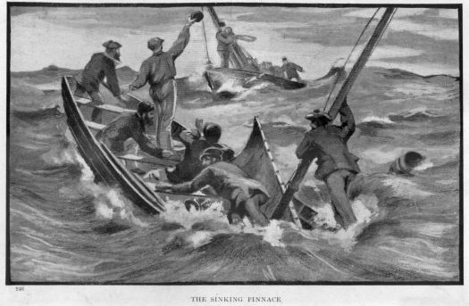 “There is a chance for them yet,” said the skipper, as the schooner continued to drive astern leaving the wretches struggling in the water, “the launch has escaped; she can pick them up.”