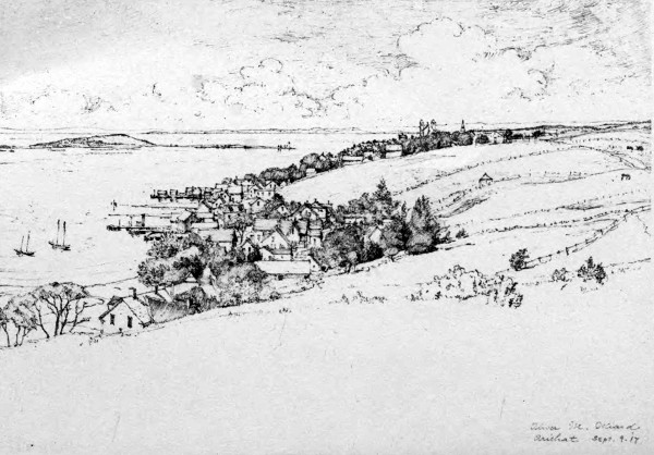 You could never forget your first sight of Arichat if you entered its narrow harbor at this divine moment. Steep, low hills, destitute of trees, set a singularly definite sky-line just behind; and the town runs—dawdles, rather—in a thin, wavering band for some miles sheer on the edge of the water. Eight or ten wharves, some of them fallen into dilapidation, jut out at intervals from clumps of weatherbeaten storehouses; and a few small vessels, it may be, are lying up alongside or anchored idly off shore. Only the occasional sound of[Pg 5] a creaking block or of a wagon rattling by on the hard roadway breaks the silence.