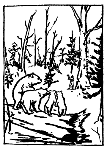 Back up the hill we went, much faster than we had come down; for we were running for our own lives now, and bears like running uphill best. On and on we went, as fast as we could go. We had no idea at how long a distance man could hit[42] us with the thunder-sticks, but we preferred to be on the safe side, and it must have been at least two hours before we stopped for a moment to take breath. And when a bear is in a hurry, two hours, even for a cub, mean more than twenty miles.