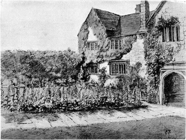 The great problems of "architectural" gardening, "landscape" gardening, and the rest, did not interest him. So simple and unpretentious was his little house that an[17] attempt at terraces, clipped evergreens, and the like, would have struck a jarring note at once. Therefore, it is quite in keeping that beautiful flowers and beautiful shrubs border one's way right up to the entrance door; nor does Nature end there, for over all the outer walls are trained lovely and fragrant climbers—Clematis, Rose, and Honeysuckle—which give the idea that the cottage does indeed "nestle" in the garden.