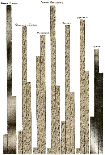 [79] A remarkable instance of this simulated atavism is the uniformity with which (according to Lacassagne, Archives de l’Anthropologie Criminelle, 1886) rapes are effected by methods common among lower races, and even animals. This is not atavism, but the criminal, being a man of primitive organisation, will naturally exercise the brutality and lack of consideration which belong to a lower race.