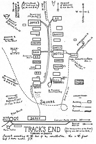 The country was a vast level prairie except to the north, where there were a few small lakes, with a little timber around them, and some coteaux, or low hills, beyond. The grass was dried up and gray. I thought I could make out a low range of hills to the 9 west, where I supposed the Missouri River was. On my way back to town a man told me that a big colony of settlers were expected to arrive soon, and that Track’s End had been built partly on the strength of the business these people would bring. I never saw the colony.