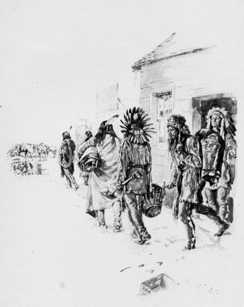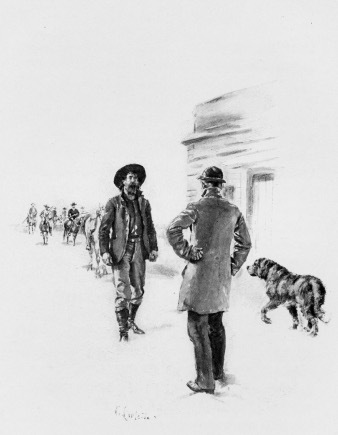 This night I felt sure the outlaws would come again, and I did not go to bed at all. I stayed all night in Townsend’s store, thinking to give them as warm a reception as I could. 196 The next morning, the 18th, the chinook had stopped, but it was still thawing, though not so fast. There was scarcely any wind, but the sun was warm. I tried to take a nap after dinner, but I was too nervous. The prairie was half bare. The little drifts were all gone and the big ones had shrunk to little ones. There was a good deal of snow in the street yet, but it would be easy to ride through it. I walked about all day trying to think of what was best to do. I knew that I could not keep awake another night. At last I decided to try putting the Indian on guard part of the night. He had said (I thought that was what he meant) that the outlaws had stolen ponies from his tribe, and I concluded he could have no love for them, even if he had none for me. I found him in the store, but he was still sullen about the spigot.