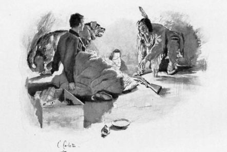 At this he grunted and said, “All right.” He waited a moment and seemed to be thinking; 197 then suddenly he raised his left hand tightly shut above his head, looked at it with half-closed eyes, and said, “Ugh! scalp ’em!”