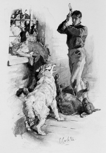 I don’t know how long it took, but at last I got my hands separated, though of course the clasps were still tightly around my wrists. I looked out of the window and saw that the sleigh was in front of the bank with a pair of the outlaws’ horses hitched to it. I was afraid that the safe had been blown open with the first explosion and that they were getting the money after all. I ran out the back door and along behind the buildings to the hotel. Kaiser bounded around me, and Pawsy was again in her old place over the door.