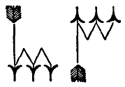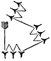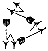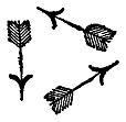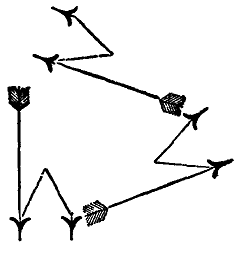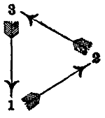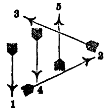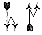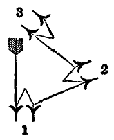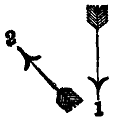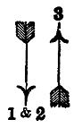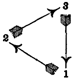 In the time, three in a bar, the first gesture made, from up to down, is likewise universally adopted for marking the first beat; but there are two ways of marking the second. The majority of orchestral conductors indicate it by a gesture from left to right; thus:—