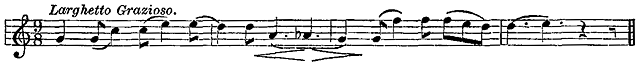 The time in which this chorus was to be taken having been first agreed upon by the orchestra, our Nestor followed it pretty decently during the first few bars; but, soon after, the slackening became such that there was no continuing without rendering the piece perfectly ridiculous. It was recommenced twice, thrice, four times; a full half-hour was occupied in ever-increasingly vexatious efforts, but always with the same result. The preservation of allegretto time was absolutely impossible to the worthy man. At last the orchestral conductor, out of all patience, came and begged him not to conduct at all; he had hit upon an expedient:—He caused the chorus-singers to simulate a march-movement, raising each foot alternately, without moving on. This movement, being in exactly the same time as the dual rhythm of the 6⁄8 in a bar, allegretto, the chorus-singers, who were no longer hindered by their director, at once performed the piece as though they had sung marching; with no less unity than regularity, and without slackening the time.
