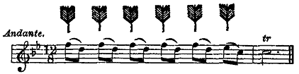 Taking the three measures shown above in order, the conductor must beat three quavers down, and three up, for the time of 6⁄8:—