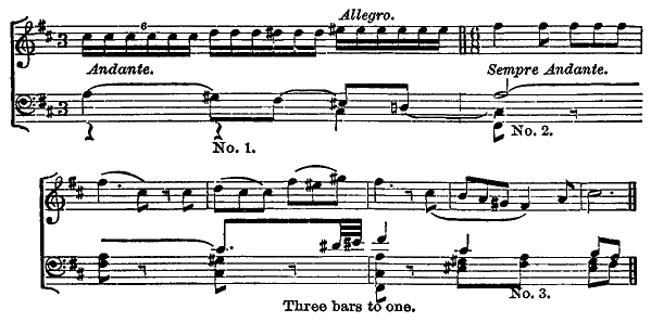 Once entered upon the combination, the little allegro in 3⁄8, of which a whole bar represents one-third, or one beat of that of the minuetto, and the other allegro in 2⁄4, of which a whole bar represents two-thirds, or two beats, correspond with each other and with the principal theme; while the whole proceeds without the slightest confusion. All that is requisite is to make them come in properly.