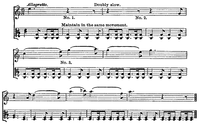 This division of the different times is intended to prevent the rhythmical divergences which might easily take place among the performers during the interval which separates one beat from the other. The conductor not indicating anything during this period (rendered somewhat considerable by the extreme slowness of the movement), the players are then entirely left to themselves, without conductor; and as the rhythmical feeling is not the same with all, it follows that some hurry, while others slacken, and unity is soon destroyed. The only exception possible to this rule is that of a first-rate orchestra, composed of performers who are well acquainted with each other, are accustomed to play together, and know almost by heart the work they are executing. Even then, the inattention of a single player may occasion an accident. Why incur its possibility? I know that certain artists feel their self-love hurt when thus kept in leading-strings (like children, they say); but with a conductor who has no other view than the excellence of the ultimate result, this consideration can have no weight. Even in a quartet, it is seldom that the individual feeling of the players can be left entirely free to follow its own dictates. In a symphony, that of the conductor must rule. The art of comprehending it, and fulfilling it with unanimity, constitutes the perfection of execution; and individual wills—which can never agree one with another—should never be permitted to manifest themselves.