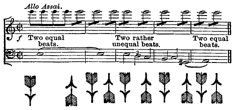 In the famous ball-scene of Mozart's Don Giovanni, the difficulty of keeping together the three orchestras, written in three different measures, is less than might be thought. It is sufficient to mark downwards each beat of the tempo di minuetto:—