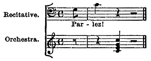I cannot approve of such a method, which nothing justifies, and which may frequently occasion accidents in the execution. Neither do I see why, in recitatives, the bar should not be divided regularly, and the real beats marked in their place, as in music beaten in time. I therefore advise—for the preceding example—that the first beat should be made down, as usual, and the stick carried to the left for striking the chord upon the second beat; and so on for analogous cases; always dividing the bar regularly. It is very important, moreover, to divide it according to the time previously indicated by the author, and not to forget,—if this time is allegro or maestoso, and if the reciting part has been some time reciting unaccompanied,—to give to all the beats, when the orchestra comes in again, the value of those of an allegro or of a maestoso. For when the orchestra plays alone, it does so generally in time; it plays without measured time only when it accompanies a voice or instrument in recitative.