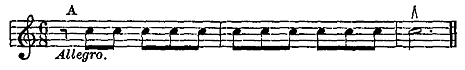 The trumpet-player, instead of taking breath before the first of these three bars, takes breath at their commencement, during the quaver-rest, A; and, not counting for anything the short time it has taken him to breathe, gives its whole value to the quaver-rest, which thus becomes super-added to the value of the first bar. The result of this is the following:—