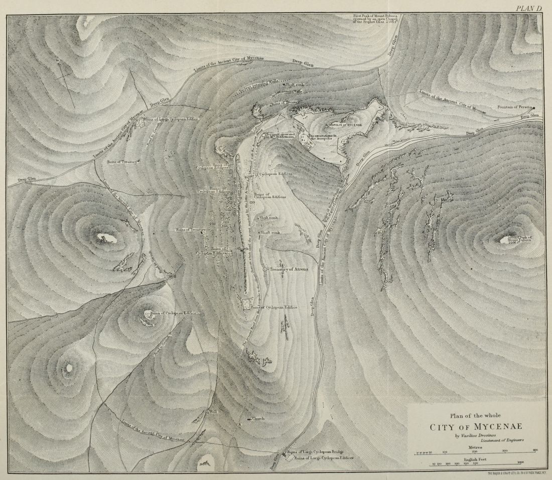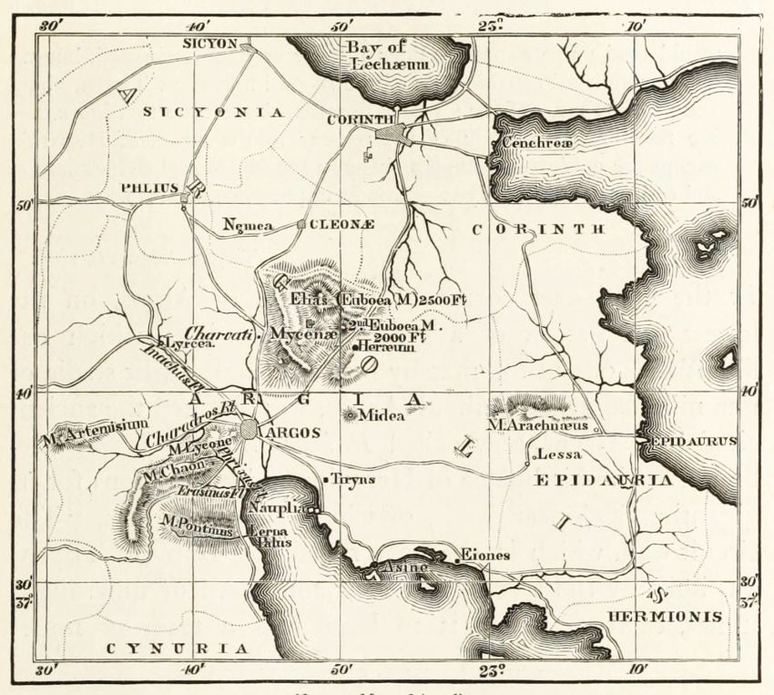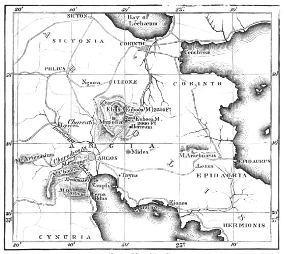 [405] This mistake seems to have been noted by critics of an early date, for both Sophocles and Euripides mention and distinguish the two cities, though they seem to confuse the inhabitants. I was unable, when on the spot, to make out the picture suggested at the opening of Sophocles' Electra, which seems, as it were, drawn on the spot, but is more probably a fancy sketch. But Mycenæ is very prominent in it. Sophocles even wrote a play called Μυκηναται.