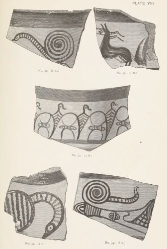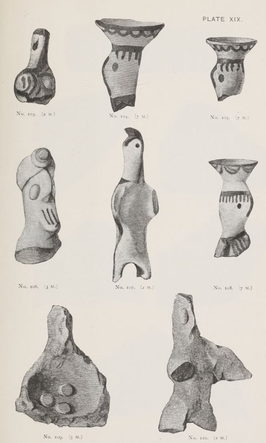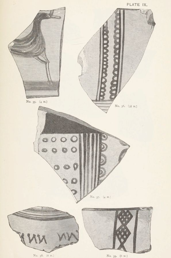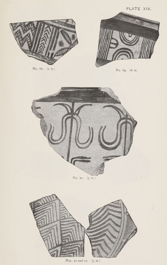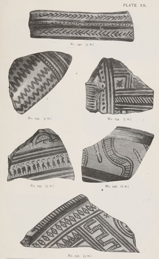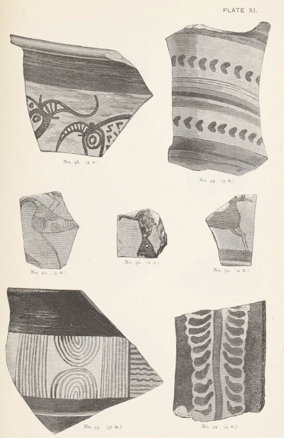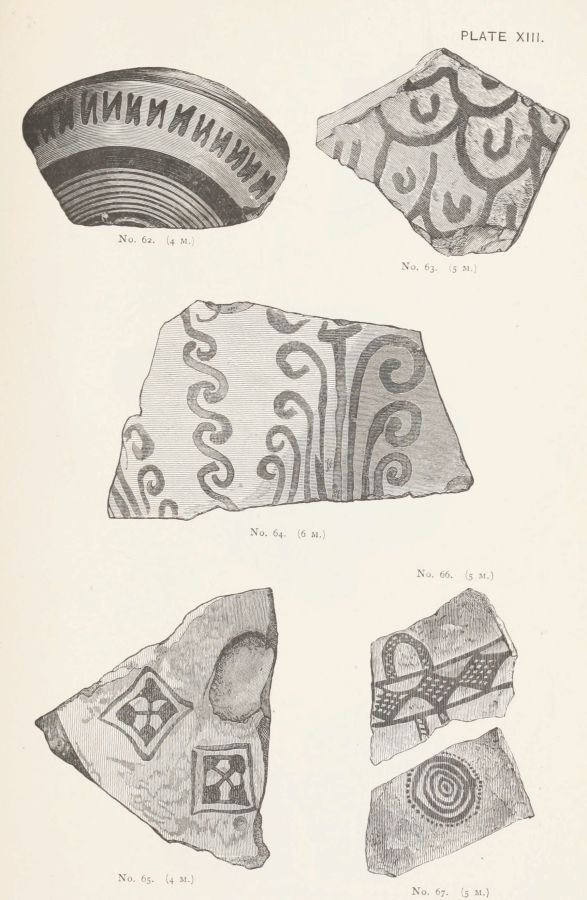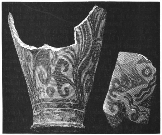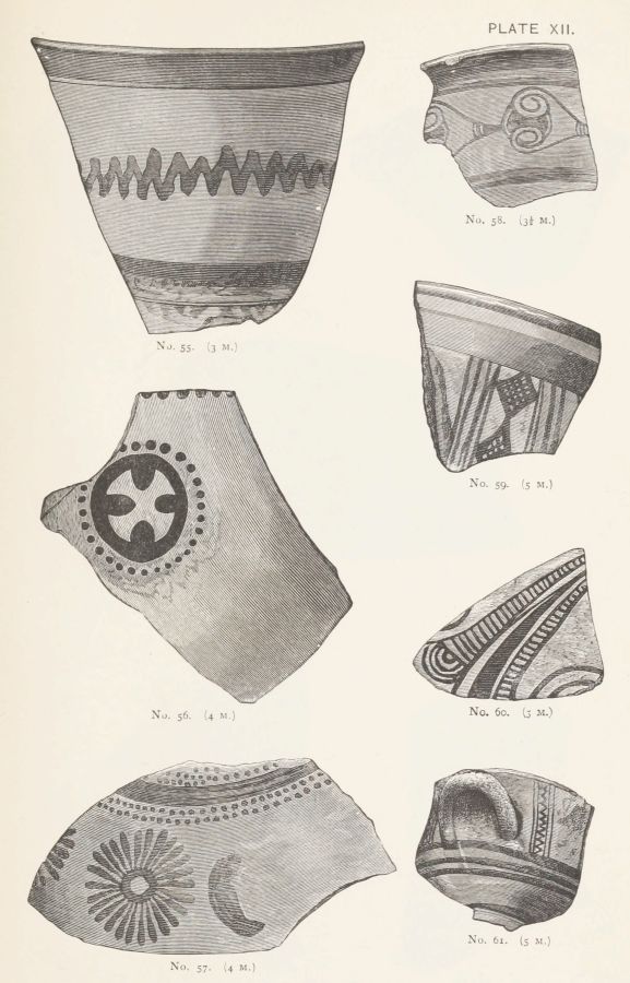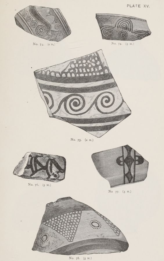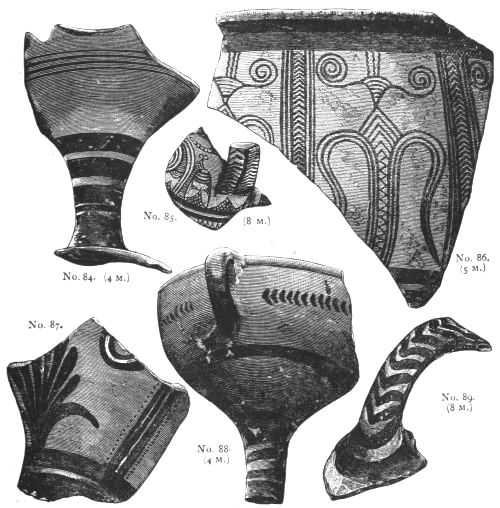 1. Upon the situation chosen for the interments, Dr. Schliemann opines that they were not originally within the Agora, but that it was subsequently constructed around the tombs (p. 340). His reasons are that the supporting wall, on which rest, in double line, the upright slabs, formerly, and in six cases still, covered by horizontal slabs as seats for the elders, is careless in execution, and inferior to the circuit wall of the Acropolis. But, if it was built as a mere stay, was there any reason for spending labour to raise it to the point of strength necessary for a work of military defence? Further, he finds between the lines of slabs, where they are uncovered, broken pottery of the prehistoric period more recent than that of the tombs. But[xxix] such pottery would never have been placed there at the time of the construction; with other rubbish, it would only have weakened and not strengthened the fabric of the inclosure. Nor can we readily see how it could have come there, until the work was dilapidated by the disappearance of the upper slabs. If so, it would of course be later in date than the slabs were.