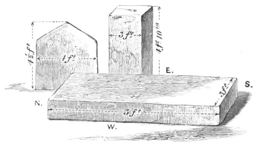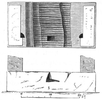 We seem thus to stand in the face of circumstances that contradict one another. The place, the depth, the coverings of the tombs, appear to lead us in one direction; the forcing and squeezing of the bodies in another. But further, and stranger still, there seems to have been no necessity for placing the bodies under this unbecoming, nay revolting, pressure. The original dimensions of the tomb (p. 294) were 21 ft. 6 in. by 11 ft. 6 in. These are reduced all round, first by an inner wall two feet thick, and secondly by a slanting projection one foot thick (at the bottom) to 5 ft. 6 in. and 15 ft. 6 in. Why, then, were the bodies not laid along, instead of across, it? Was not the act needless as[xxxiii] well as barbarous? And to what motive is a piece of needless barbarism, apparently so unequivocal, to be referred? I hardly dare to mention, much less, so scanty is the evidence, to dwell upon the fact that their bodies lie towards the west, and that the Egyptian receptacle for the dead lay in that quarter.[14] The conflict of appearances, at which we have now arrived, appears to point to a double motive in the original entombment; or to an incomplete and incoherent proceeding, which some attempt was subsequently made to correct; or to both. But let us pay a brief attention to the remaining particulars of the disclosures.